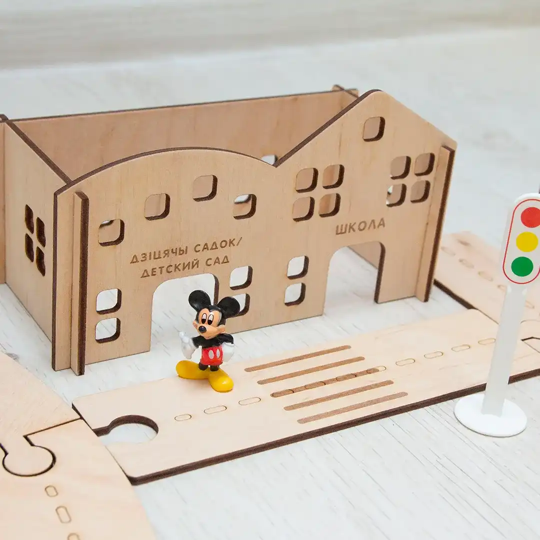 В наборе 36 деревянных элементов для 9 домиков и 20 элементов для дороги. Объекты инфраструктуры подписаны на двух языках (белорусском и русском).