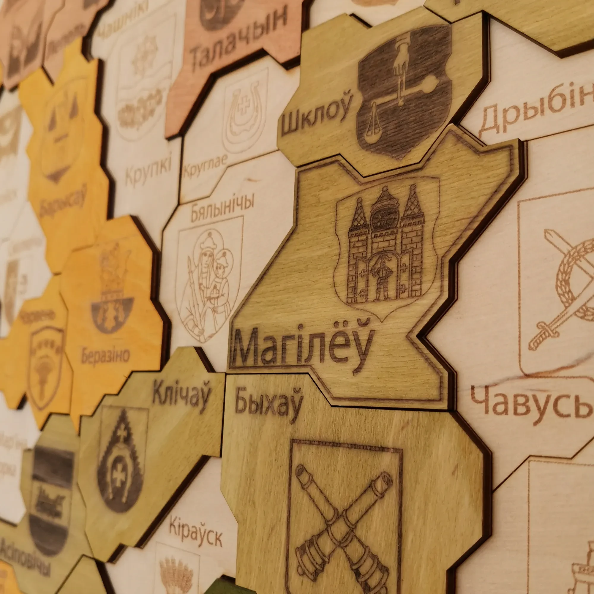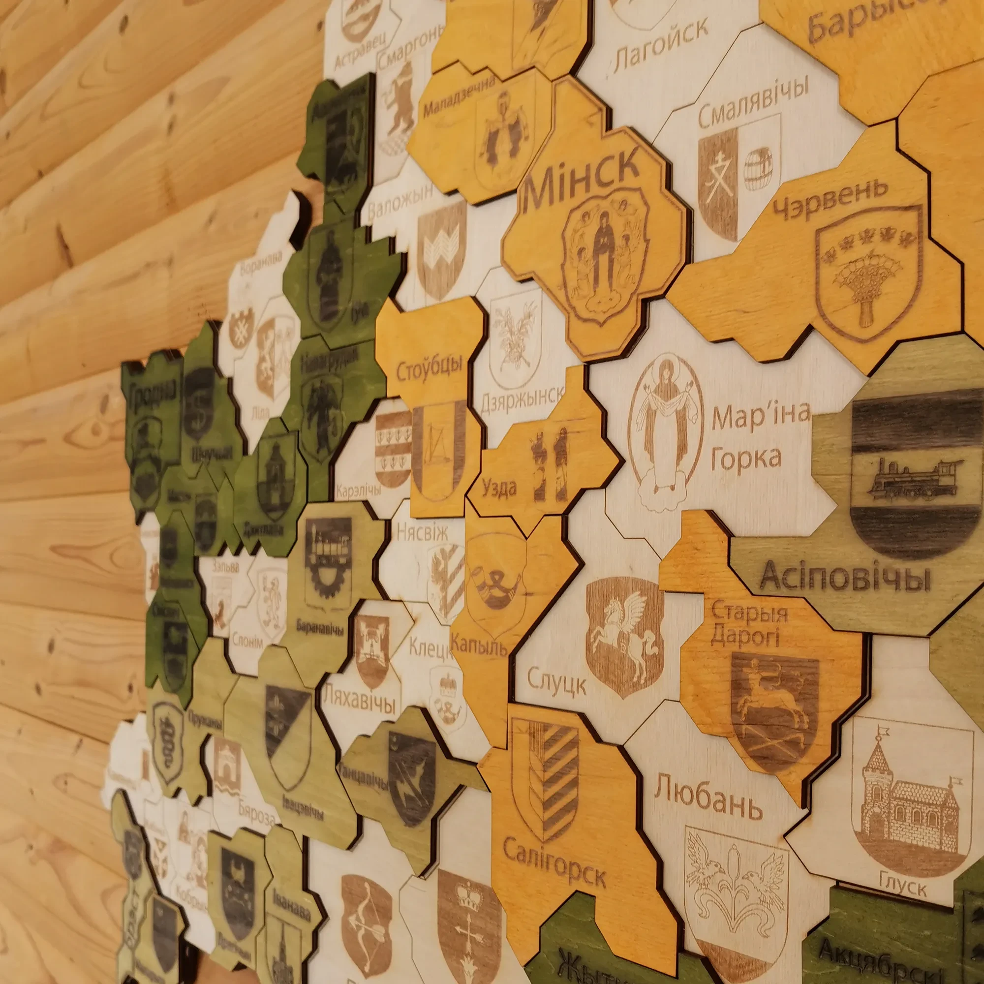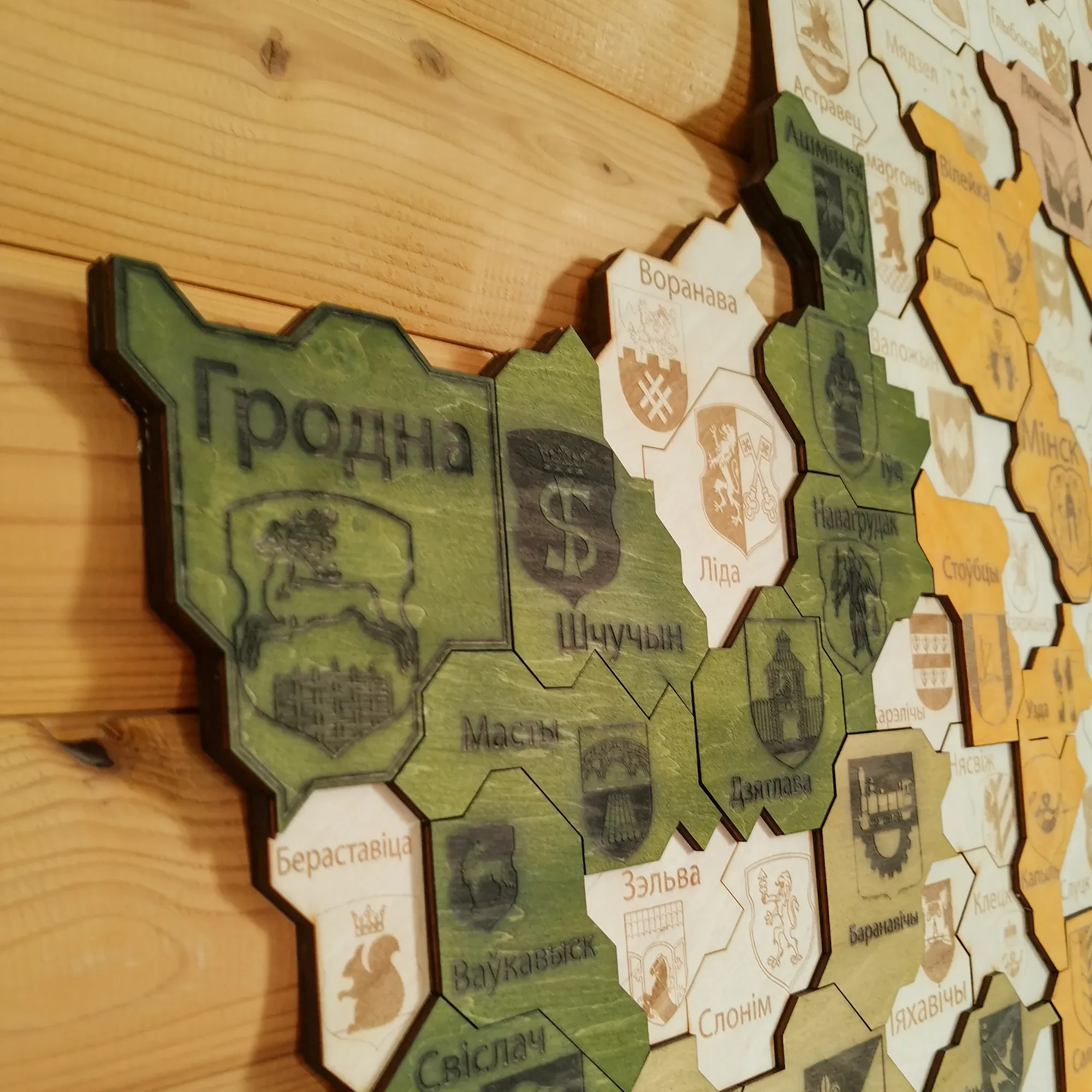 Карта Беларуси изготовлена с эффектом объема и включает в себя 118 районов с гербами. Тонировка осуществляется по палитре, возможно согласование цветовых сочетаний с Покупателем.