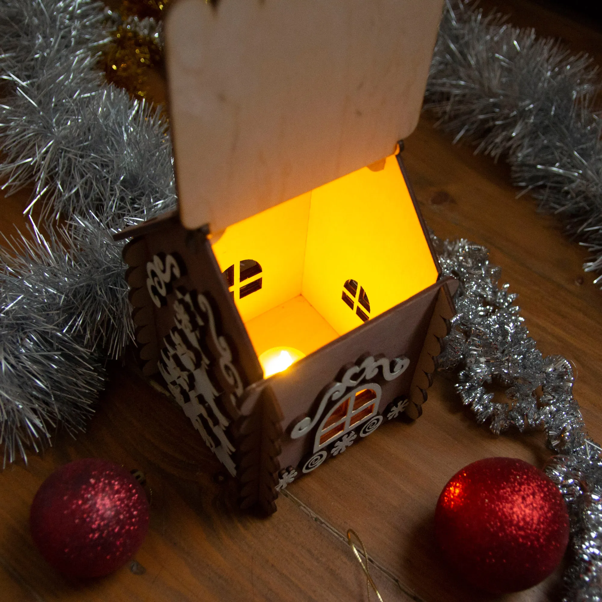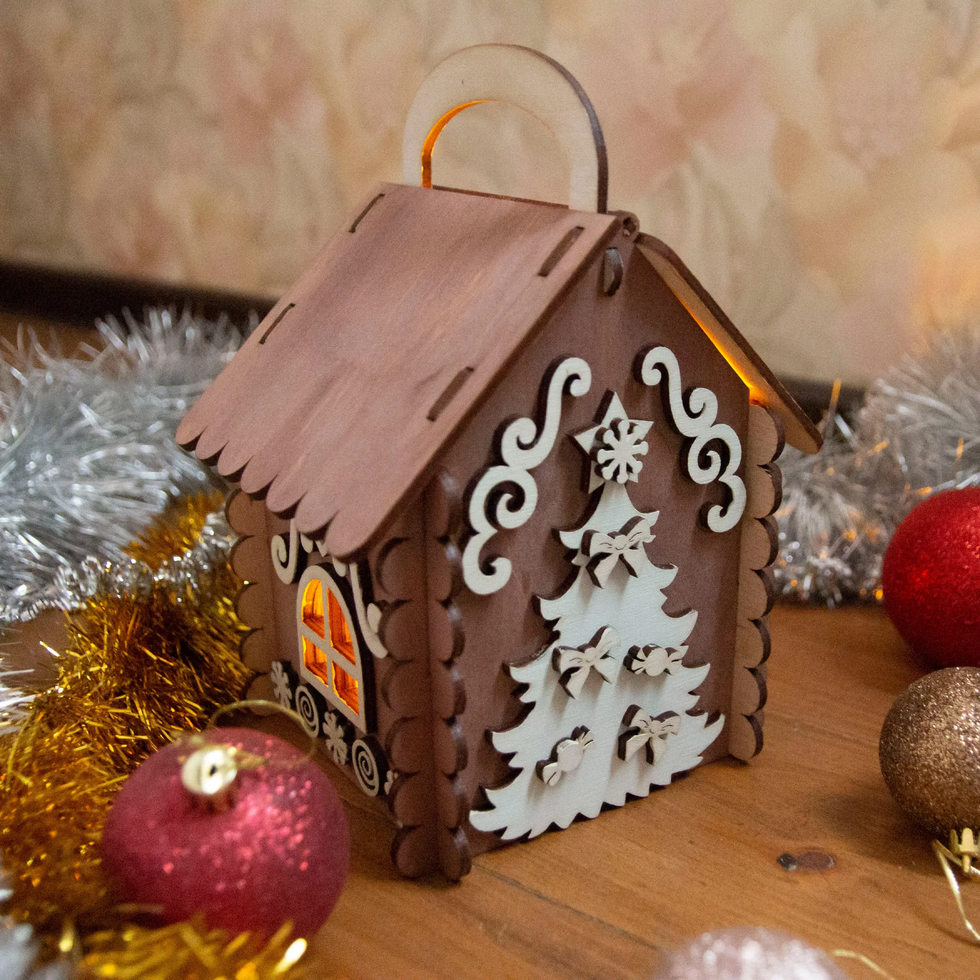 Новогодний пряничный домик с подсветкой можно наполнить печеньем, конфетами, пряниками, леденцами, мармеладом, что доставит огромное удовольствие получателю такого подарка.